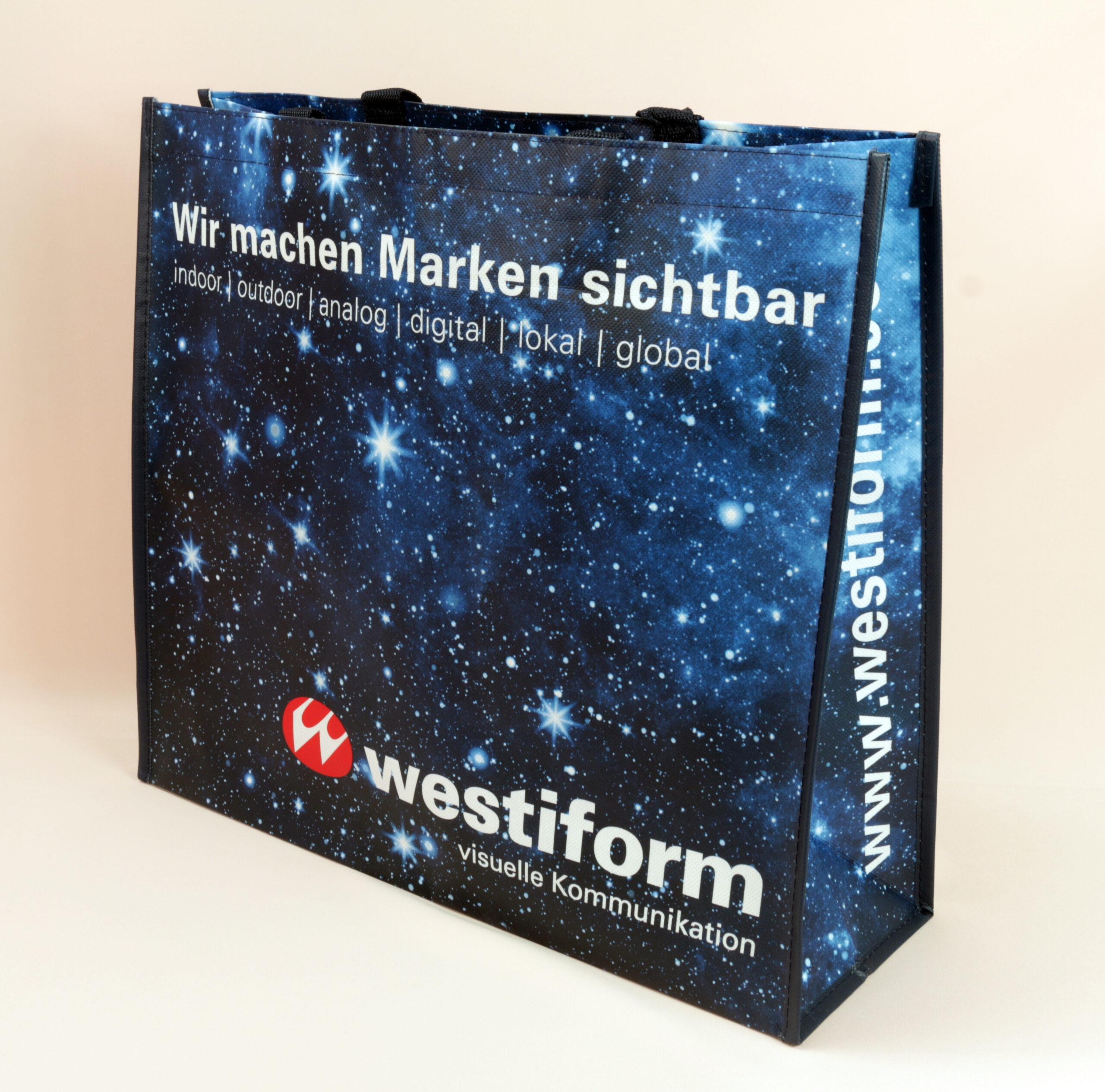 Die Kombination aus der astronomischen Grafik und dem auffällig platzierten Firmenlogo sorgt dafür, dass diese Tasche nicht nur als praktisches Accessoire dient, sondern auch als effektiver Werbeträger. Durch den großflächigen Aufdruck und die kräftigen Farben hebt sich die Tasche deutlich von herkömmlichen Tragetaschen ab und bleibt im Gedächtnis.