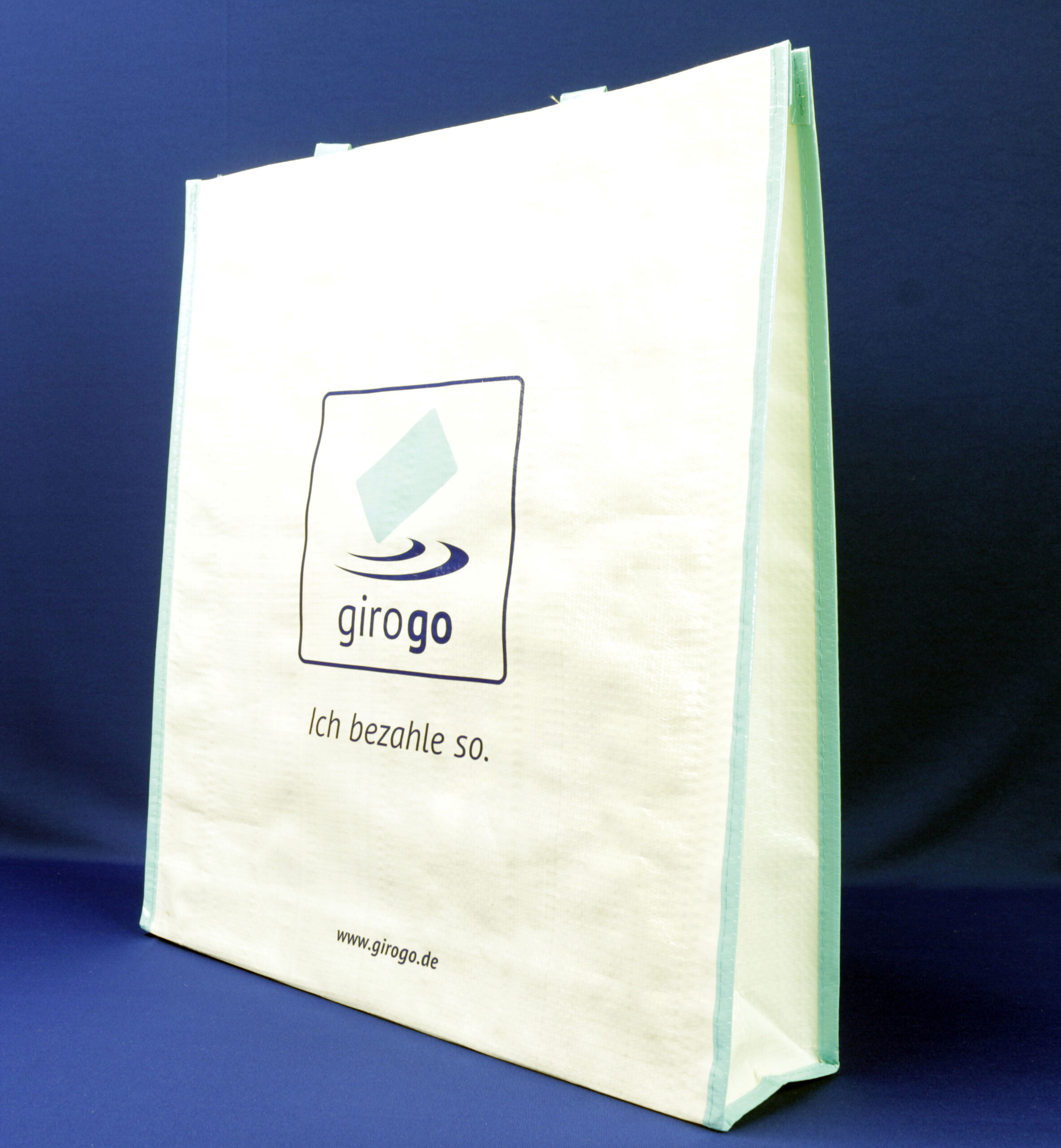 Auf der Vorderseite der Tasche befindet sich das girogo-Logo, begleitet von dem Slogan „Ich bezahle so.“ – eine klare Botschaft, die das moderne kontaktlose Bezahlsystem von girogo bewirbt. Die Rückseite der Tasche trägt eine freundliche Aufforderung „Mach‘ dich beliebt! Bezahl‘ mit girogo“, versehen mit einem lächelnden Icon, das der Tasche eine positive und einladende Ausstrahlung verleiht. Das Design in Blau und Weiß sorgt für eine saubere, minimalistische Optik, die sowohl funktional als auch ansprechend wirkt.