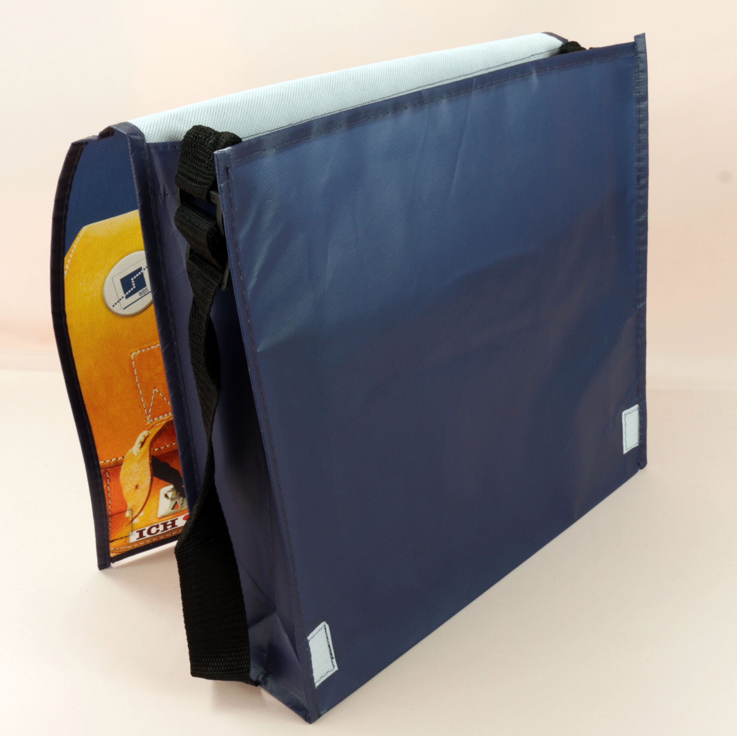 Das Highlight der Tasche ist der aufgedruckte gelbe Schulranzen mit dem auffälligen Schriftzug „WBS – Wir bilden Sie weiter…“, der der Tasche ein einzigartiges und lebendiges Design verleiht. Diese kreative Gestaltung hebt die Tasche von herkömmlichen Modellen ab und macht sie zu einem echten Hingucker, sei es auf dem Weg zur Arbeit, in der Schule oder bei Seminaren.